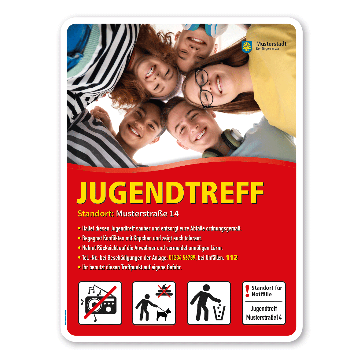 Freizeitschild - Jugendtreff mit 4 frei zu wählenden Piktogrammen – Schilderserie SP-02