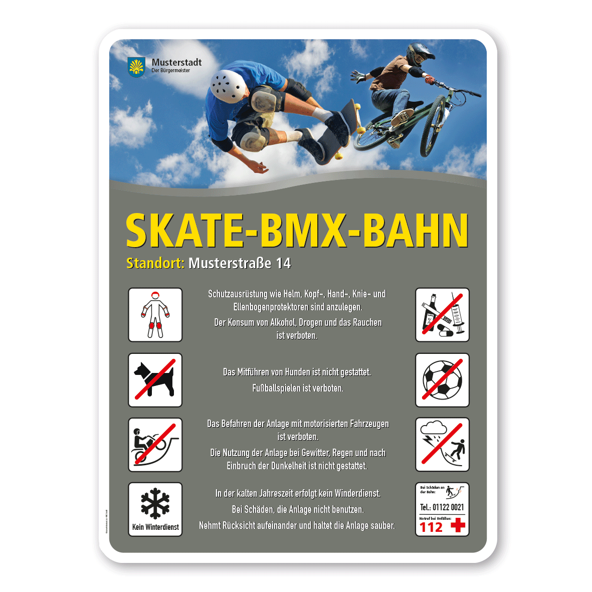 Spielplatzschild - Skate-BMX-Bahn mit 8 frei zu wählenden Piktogrammen – Schilderserie SP-02