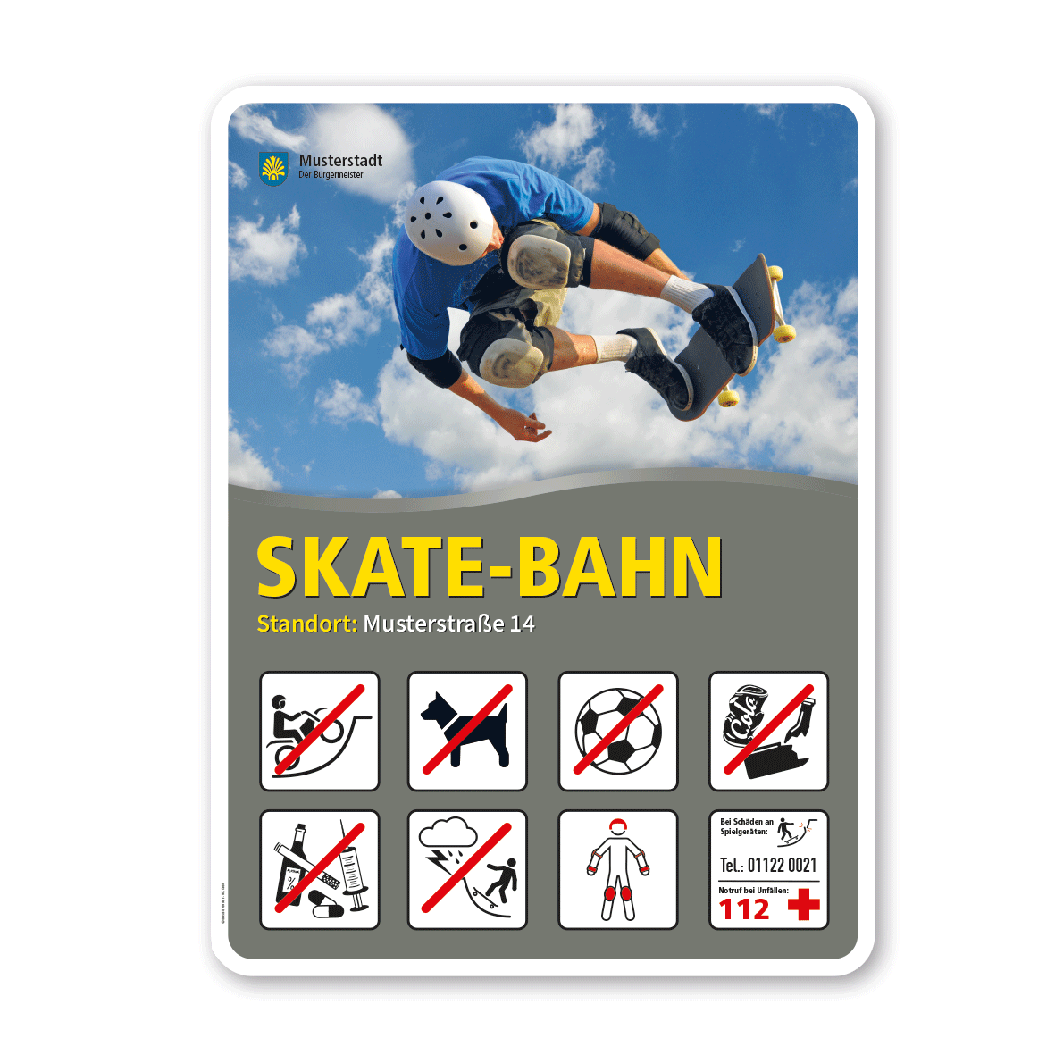 Spielplatzschild - Skate-Bahn mit 8 frei zu wählenden Piktogrammen – Schilderserie SP-02