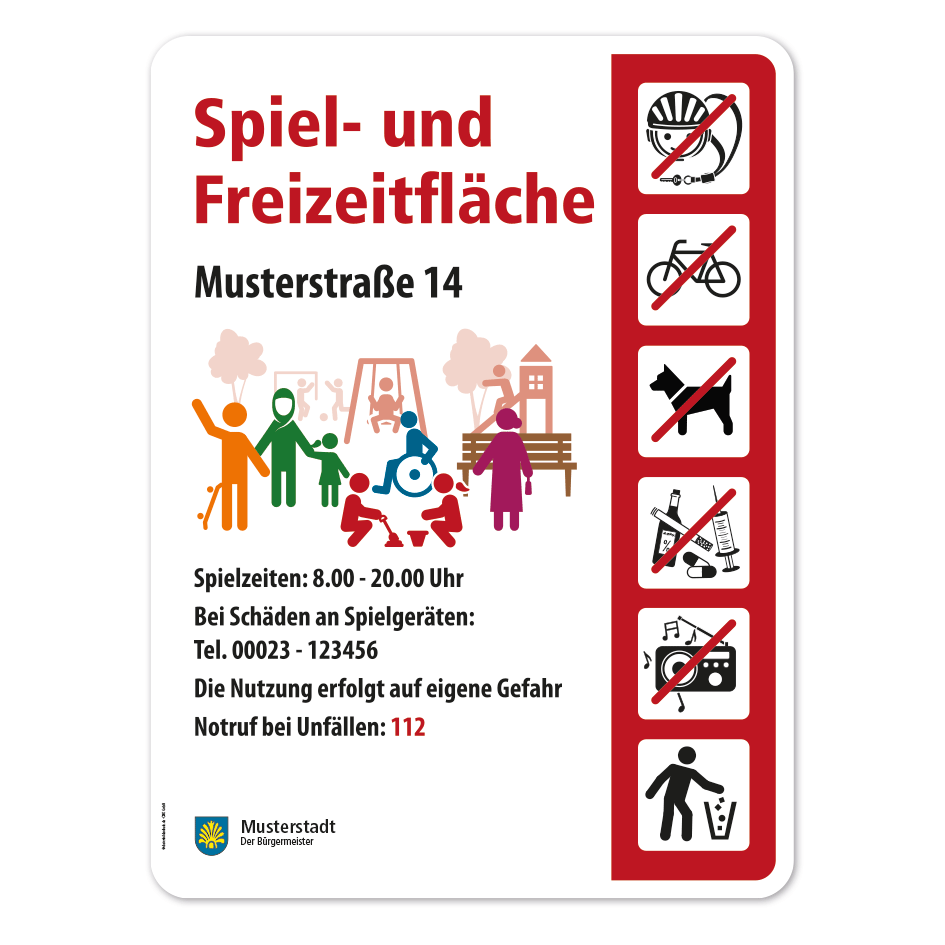 - Bitte beachten Sie, dass konfigurierte Spielplatzschilder und Sportplatzschilder individuelle Artikel sind. Ein Rückgaberecht ist ausdrücklich ausgeschlossen.