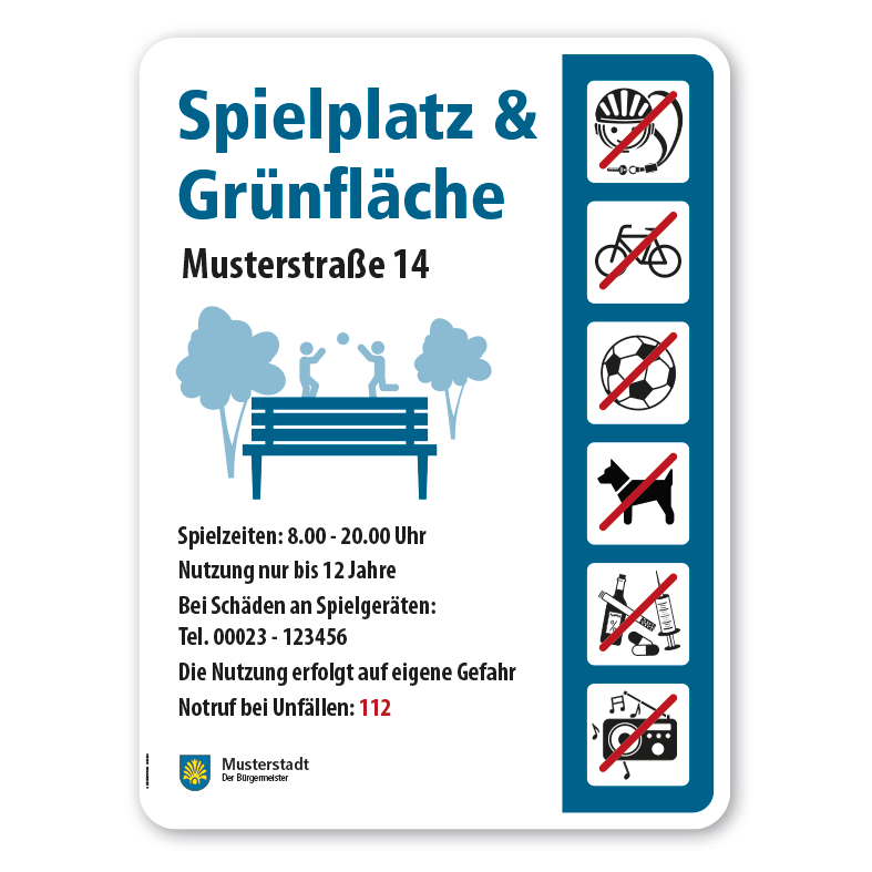 - Bitte beachten Sie, dass konfigurierte Spielplatzschilder und Sportplatzschilder individuelle Artikel sind. Ein Rückgaberecht ist ausdrücklich ausgeschlossen.