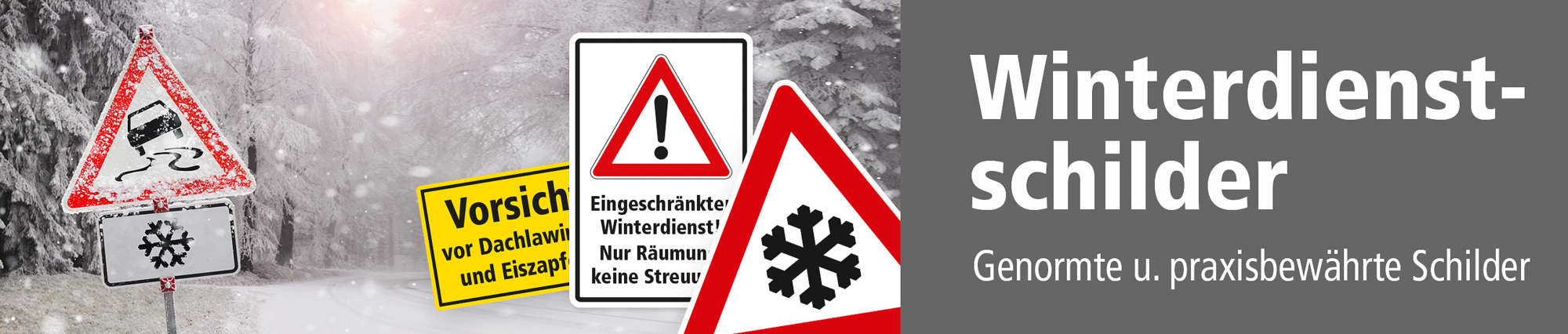 Wir führen in dieser Kategorie zahlreiche Winterdienstschilder für die gängigsten Anforderungen. Die Schilderausführungen reichen von einfachen Textschilder bis hin zu aussagekräftigen Kombinationsschildern mit Symbolen zur Rutschgefahr, zu herabfallenden Eiszapfen und sich lösenden Schneelawinen. Ergänzende Schilder zu Winterdiensteinschränkungen sowie Verkehrszeichen und Sicherheitssymbole für die Winterzeit runden unser Angebot ab. Unsere Winterdienstschilder sind in diversen Größen erhältlich, bei Bedarf auch mit Ihren Wunschtexten und anderen Symbolen wie auch je nach Artikel in reflektierenden Varianten. Sollten Sie bestimmte Schilder zum Winterdienst benötigen, die wir nicht in unserem Online-Shop führen, bitten wir um Nachricht. Wir fertigen Schilder auch nach Ihrer Vorgabe. Gerne unterbreiten wir Ihnen unser Angebot.