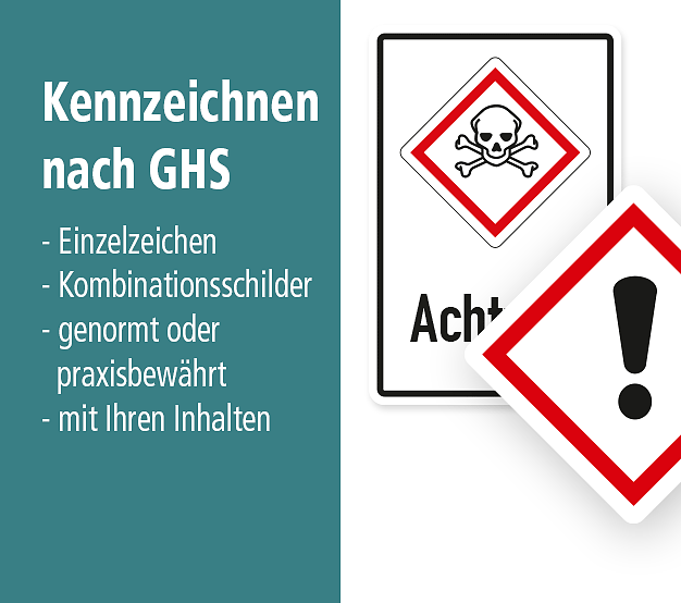Wir produzieren Gefahrstoffschilder nach GHS in zahlreichen Größen und Ausführungen für jeden Einsatzzweck an – als einzelne GHS-Zeichen mit einer genormten, unmissverständlichen Symbolik, aber auch als Kombinationsschilder mit zusätzlichen Textinformationen, die die Bedeutung einzelner GHS-Zeichen unterstreichen oder aufgrund bestimmter Erfordernisse nötig sind. Die Grundfarbe von Gefahrstoffschildern nach GHS ist weiß mit einem roten Rahmen, de umlaufend von einem weißen Rahmen begrenzt wird. Ein schwarzes, mittig platziertes Symbol weist auf die jeweilige Gefahr hin.