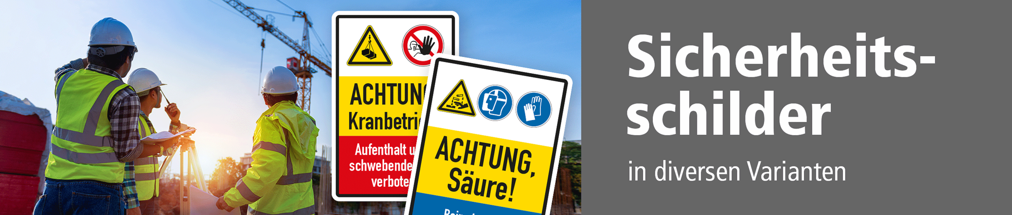 Sicherheitsschilder sind erforderliche Hinweise, die in Betrieben der Kennzeichnung von Gefahrenstellen dienen, um Menschen auf diese aufmerksam zu machen, damit sie sich am Aufstellungsort umsichtig verhalten. Dies erfolgt in der Regel mit genormten oder praxisbewährten Warnzeichen, Verbotszeichen oder Gebotszeichen in Einzelausführung oder in einer kombinierten Variante, bestehend aus einem Sicherheitszeichen und passenden Textinhalt. Wir haben diese Kombinationsschilder erweitert und bieten Ihnen die Möglichkeit, Sicherheitsschilder auch mit mehreren Sicherheitszeichen zu bestellen, auch in einer gemischten Form, sowie Texterläuterungen, die je nach Bedeutung noch mit farbigen Balken unterlegt sind. Die Farbgebung dieser Balken entspricht dann den platzierten Sicherheitszeichen: gelb für Warnungen, rot für Verbote und blau für Gebote.