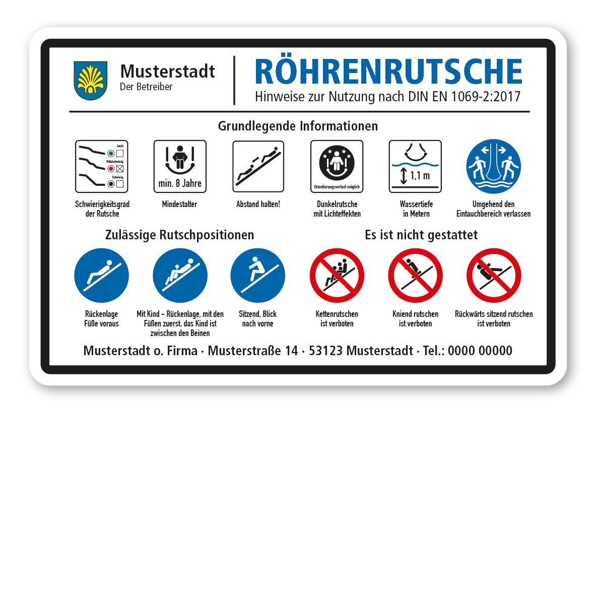 Schild für Wasserrutschen - Röhrenrutsche - nach DIN EN 1069-2:2017 – Hinweise und Verhaltensregeln für Wasserrutschen als Kombinationsschild mit individueller Zeichen- und Textwahl. Unsere Kombinationsschilder für Wasserrutschen erfüllen mit der richtigen Wahl der Sicherheitszeichen und den benötigten Zusatzinformationen sowie Betreiberinformationen die Beschilderungsvorgaben nach DIN EN 1069-2:2017. Die vielfälltigen Individualisierungsmöglichkeiten erfüllen zudem auch alle Voraussetzungen für eine flexible, bedarfsbezogene Beschilderung Ihrer Wasserrutsche.