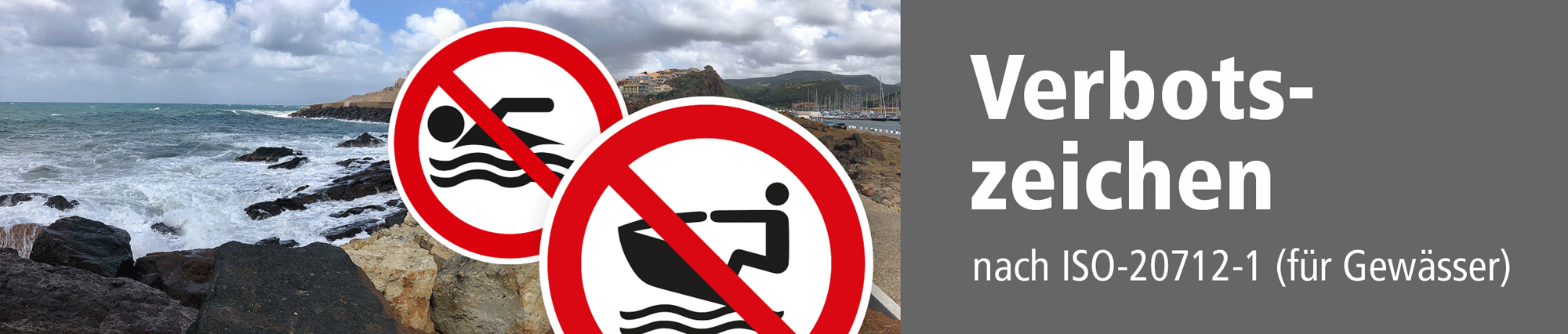 Verbotsschilder und Verbotszeichen nach ISO 20712-1 sind erforderliche Hinweise, die an Gewässern und Hafenbereichen zum Einsatz kommen, wo Gefahren für Menschen bestehen oder wenn bestimmte Handlungen ausdrücklich unerwünscht sind, um sich oder andere nicht zu gefährden. Als Verbotszeichen werden runde Schilder mit einem breiten roten Rahmen und einem diagonal verlaufenden Balken über schwarzen, genormten Symbolen, die die jeweiligen Verbote unmissverständlich darstellen, bezeichnet. Verbotsschilder und Verbotszeichen nach ISO 20712-1 werden an Gewässern eingesetzt, um die Sicherheit zu erhöhen und die Unversehrtheit bzw. Gesundheit der Menschen zu erhalten.