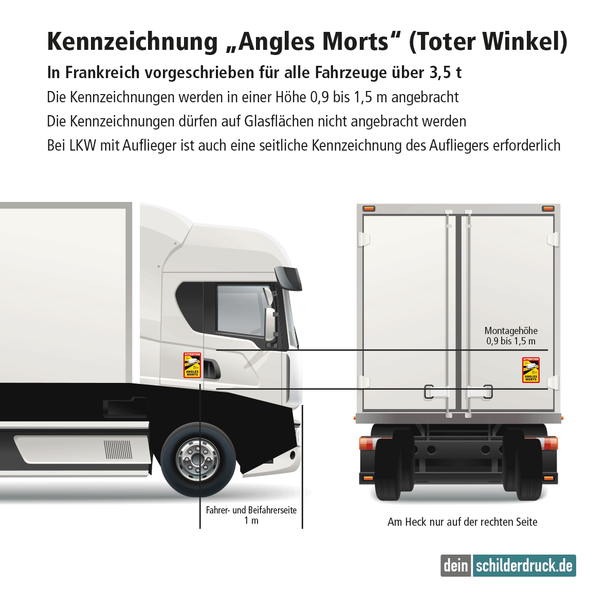 Die französische Straßenverkehrsordnung schreibt zum Schutz von Fußgängern, Roller- und Fahrradfahrern vor, dass jedes Fahrzeug über 3,5 Tonnen mit dieser Kennzeichnung ausgestattet sein muß. Dies betrifft LKW, Busse und Wohnmobile. Diese Verordnung gilt auch für ausländische Fahrzeuge. Die Kennzeichnungen "Angles Morts" sind an den Fahrer- und Beifahrertüren sowie an der rechten Seite des Fahrzeughecks anzubringen. Es werden somit drei Kennzeichnungen für ein Fahrzeug benötigt. Für Fahrzeuge mit Auflieger sind zusätzliche Kennzeichnung der Auflieger erforderlich. Wir bieten die offiziellen Kennzeichnungen als Aufkleber, Magnetfolien oder Schilder an.