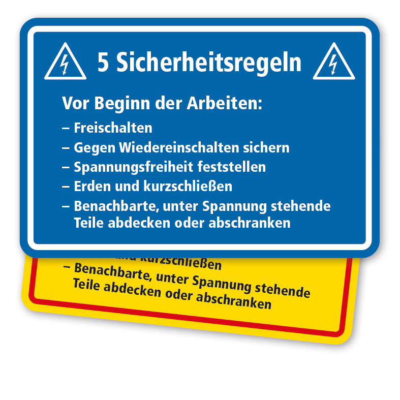 Hinweisschild 5 Sicherheitsregeln in zwei Farbausführungen – als Gebots- oder Warnschild. In diversen Größen erhältlich, auch mit Ihrem Wunschtext.