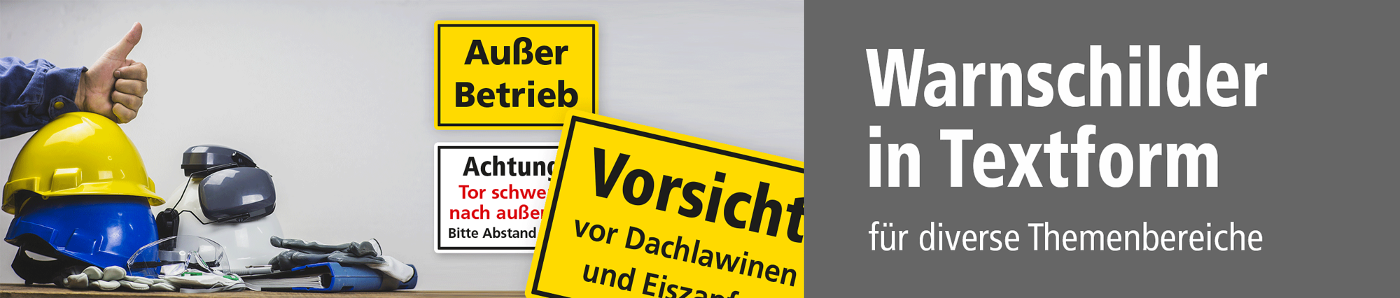 Wir führen in dieser Kategorie diverse Warnschilder als Textschilder in zahlreichen Größen für eine bedarfsgerechte Kennzeichnung. Sollten Sie spezielle Textschilder benötigen, die wir nicht in unserem Online-Shop führen, bitten wir um Nachricht. Wir fertigen Warnschilder mit Textinhalten auch nach Vorgabe. Gerne unterbreiten wir Ihnen unser Angebot.