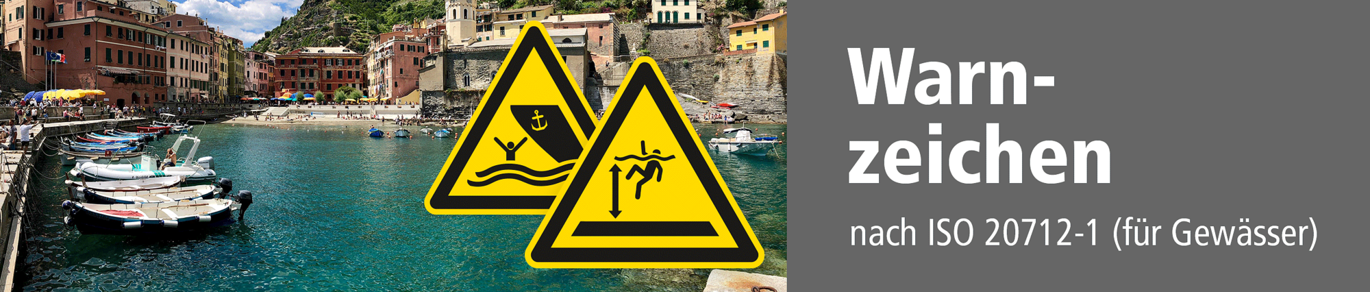 Warnschilder und Warnzeichen nach ISO 20712-1 sind erforderliche Hinweise, die an Gewässern und Hafenbereichen zum Einsatz kommen, wo Gefahren für Menschen bestehen oder wenn bestimmte Handlungen ausdrücklich unerwünscht sind, um sich oder andere nicht zu gefährden. Warnzeichen sind stets dreieckig mit einem schwarzen Rand und Symbol auf gelbem Grund. Wie andere Sicherheitszeichen auch, werden Warnschilder eingesetzt, um die Sicherheit bei Arbeitsprozessen zu erhöhen und die Unversehrtheit bzw. Gesundheit der Menschen zu erhalten.
